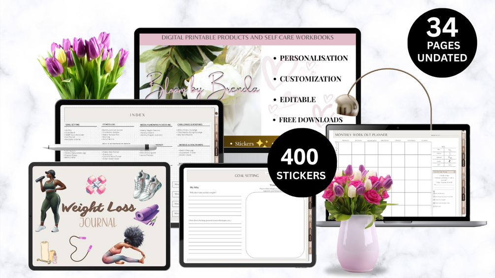 Take charge of your fitness journey with our digital-friendly Weight Loss Journal & Fitness Planner! Packed with functional pages and motivational Fitness Stickers, this bundle will help you: